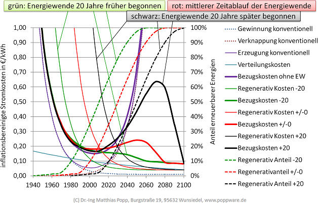 Die gestrichelten Linien in grün, rot und schwarz stellen den Fortschritt der Transformation dar. Sie beziehen sich auf die rechts angebrachte vertikale Prozent-Achse. Sie geben zum jeweiligen Zeitpunkt den konventionellen und den regenerativ Anteil der genutzten Energien an. 0% zu Beginn des Transformationsprozesses bedeutet eine ausschließlich konventionelle Versorgung. 100% am Ende des Transformationsprozesses steht für eine 100% regenerative Versorgung. Es wird angenommen, dass die Transformation einen einige Jahrzehnte umfassenden Forschungsvorlauf erfordert, sie dann mit zunehmendem Tempo umgesetzt wird und zum Schluss noch einen Nachlauf aufweist, bis 100% regenerative Versorgung erreicht sind. In dem als Prinzipdarstellung zu verstehenden Diagramm ist ein Gesamttransformationszeitraum von 120 Jahren angenommen, wobei die größten Umstellungen in einem Zeitfenster von ca. 50 Jahren angenommen sind. Die an den Achsen angetragenen Zeit-, Kosten- und Prozentwerte erheben keinen Anspruch auf Korrektheit sondern sollen nur eine grobe Einordnung des gesamten Umstellprozesses ermöglichen. Je nach Beginn und zeitlichem Ablauf der Transformation, findet diese auf einem unterschiedlichen Kostenniveau für konventionelle Energie statt. Die Kosten zur Entwicklung und Markteinführung der erneuerbaren Energien wurden für die Darstellung der prinzipiellen Zusammenhänge immer in gleicher Höhe angesetzt. Es zeigt sich, dass eine zu spät begonnene Transformation erheblich höhere Energiekosten verursachen würde (dicke Linien in grün, rot und schwarz). Am kostengünstigsten ist die Transformation auf niedrigem bzw. noch fallendem Kostenniveau für konventionelle Energieträger zu erreichen. In der Anfangsphase entstehen dabei jedoch Kostennachteile gegenüber Energiesystemen, die keine Vorsorge für die Zeit danach treffen.
