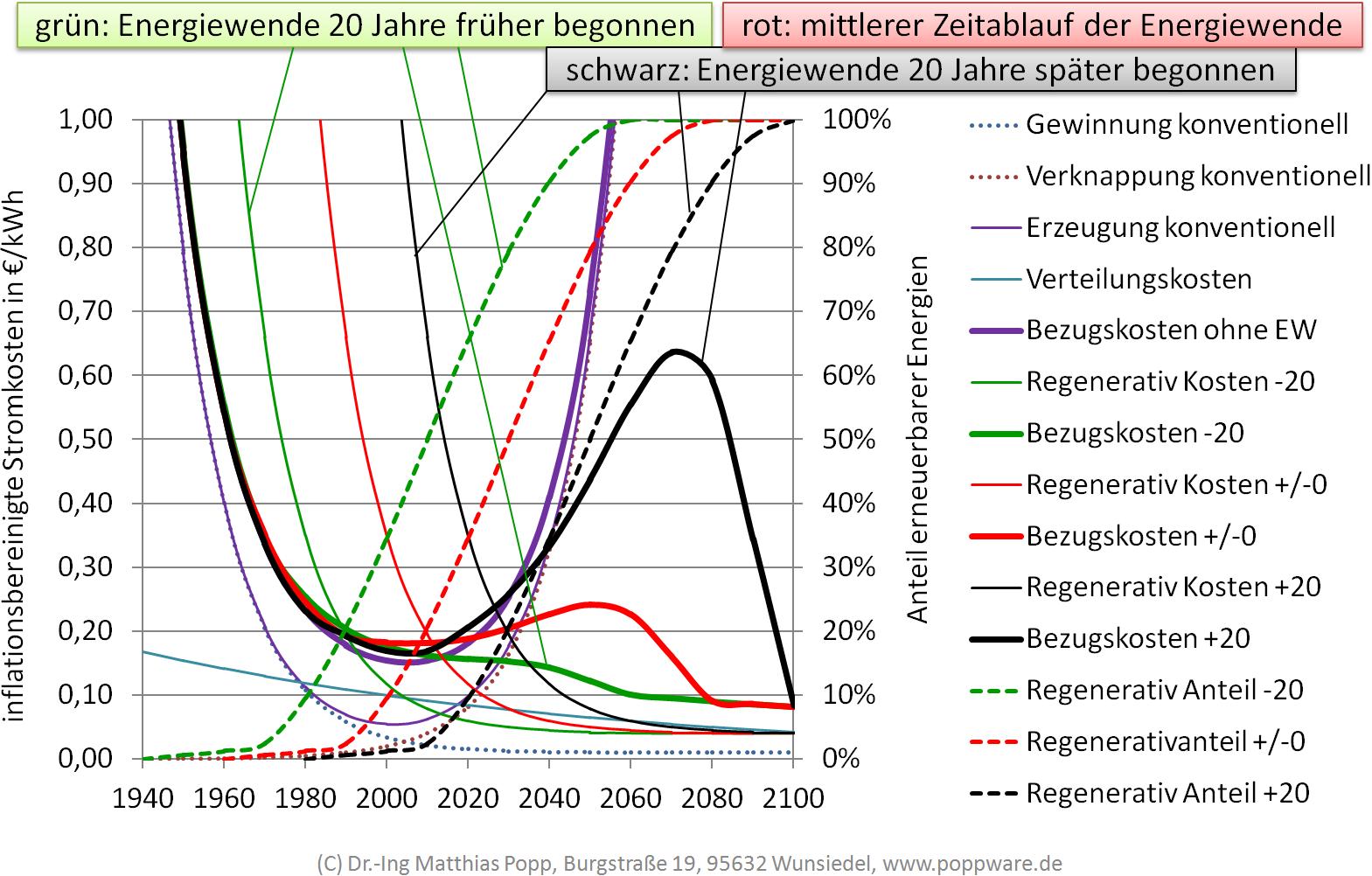 jedoch nicht aus den Augen verloren werden. Verzögerungen der Energiewende können daher tendenziell zu einer Erhöhung der anfallenden Energiekosten über den Gesamtzeitraum der Umstellung hinweg führen. Über die richtige Vorgehensweise wird man aber erst im Nachhinein urteilen können. Die tatsächliche Kostenentwicklung sowohl der konventionellen als auch der regenerativen Energien unterliegen heute unbekannten zukünftigen Entwicklungen und können auf der Basis heutiger Erkenntnisse zwar prognostiziert aber nicht vorhergesagt werden. Unkonventionelle Gewinnungstechniken für fossile Energieträger wie etwa Fracking, die eine Verzögerung des Anstiegs der Verknappungskosten bewirken, können deshalb dazu beitragen, die Energiewende auf einem verträglicheren Kostenniveau umzusetzen, wenn der Umstellungsprozess dadurch nicht ausgesetzt oder verzögert wird. Diese hier prinzipiell aufgezeigten Zusammenhänge sollten berücksichtigt werden, wenn über die zeitliche Umsetzung der Energiewende diskutiert wird. Die Kosten zur Technologieentwicklung werden immer anfallen. Anfängliche Kostennachteile werden jedoch ab dem Zeitpunkt kompensiert, ab dem Kostengleichheit für konventionell und regenerativ gewonnene Energie eintritt.